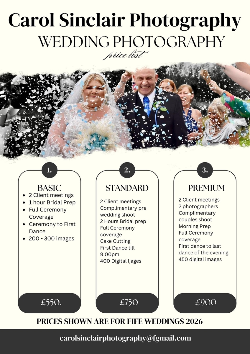 Prices for my wedding packages are for weddings based within Fife.